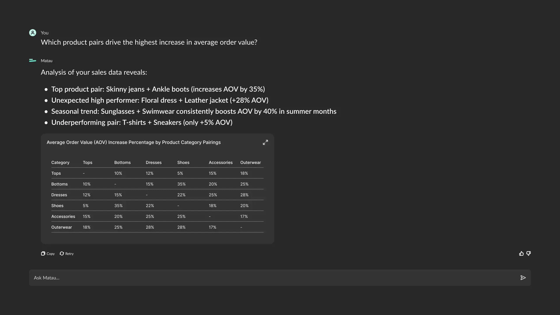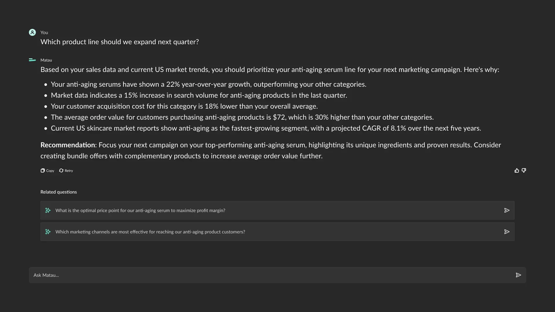 Matau uses artificial intelligence in e-commerce and other fields to look at your business data. It's like having a super-smart assistant do your database analytics. You simply chat with Matau, asking questions in everyday language. Then, Matau's AI brain analyzes your data and gives you clear, helpful answers and insights.