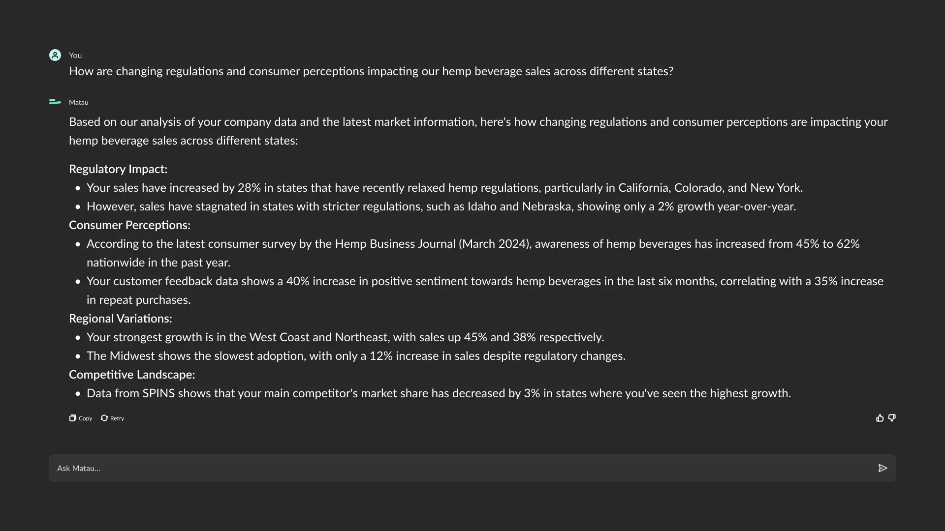 Forget complex Excel files and confusing dashboards. With Matau, simply ask your questions in your language and get instant, clear answers.