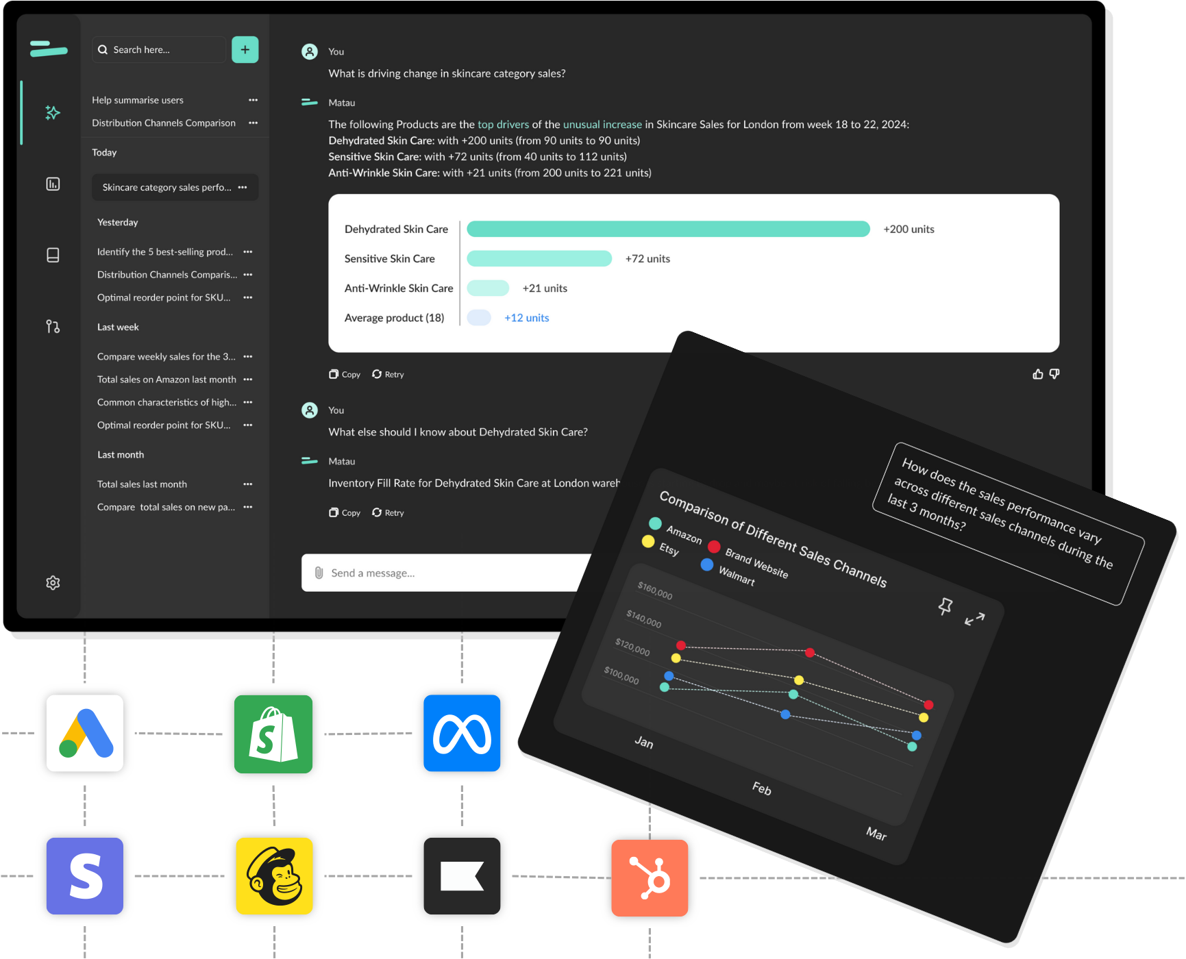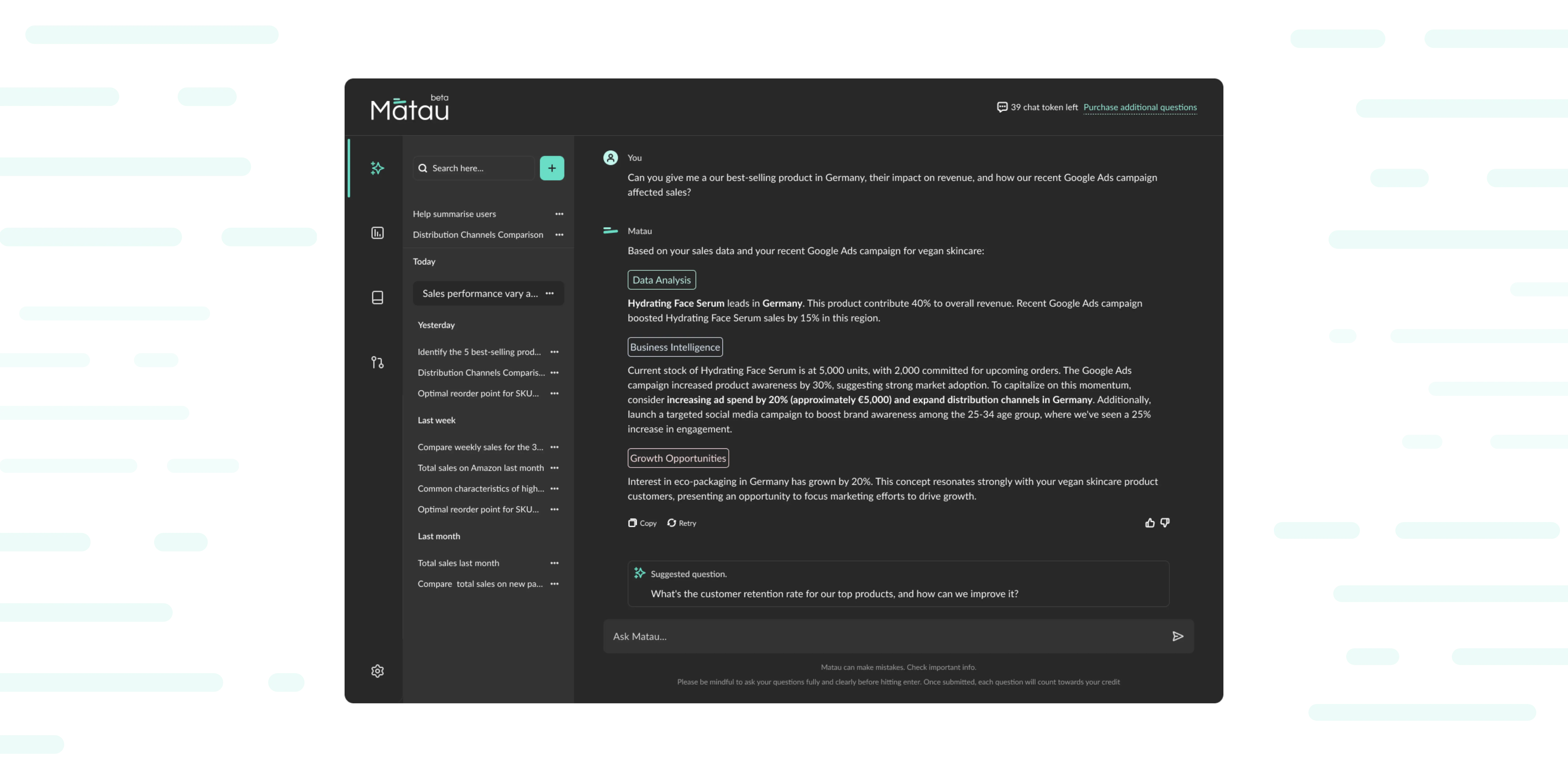 Simply ask Matau questions in plain language. Get clear, actionable answers without decoding confusing visuals. Transform data analysis into a natural dialogue for faster understanding.